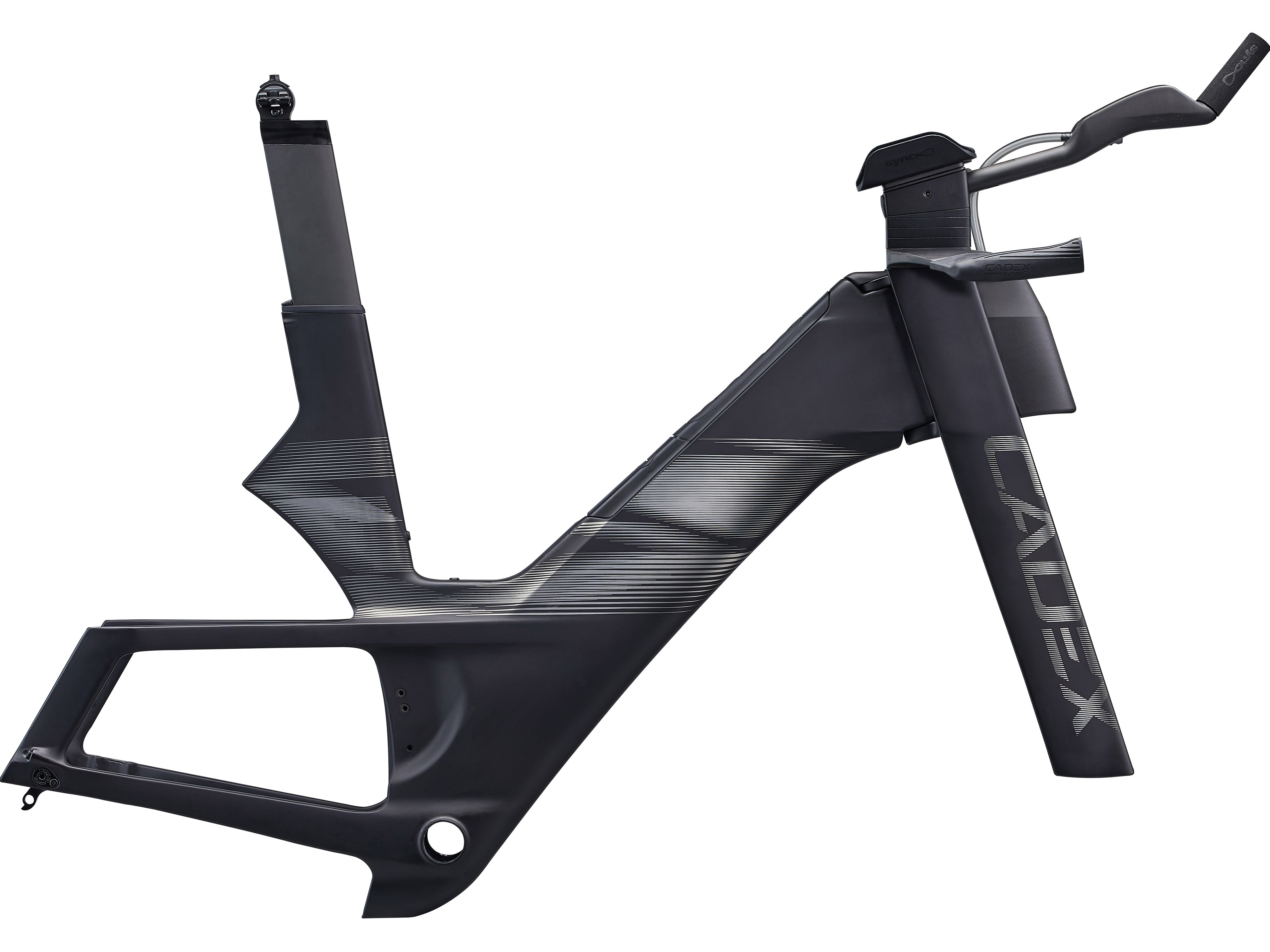 El chasis único del cuadro CADEX Tri, un enorme tubo inferior sin tubo superior, ofrece una solución completa de hidratación, nutrición y almacenamiento de herramientas totalmente integrada en el cuadro. Este diseño permite al triatleta hidratarse y repostar de forma rápida y cómoda desde la posición aero de pedaleo al mismo tiempo que se mantiene totalmente autosuficiente en el recorrido.